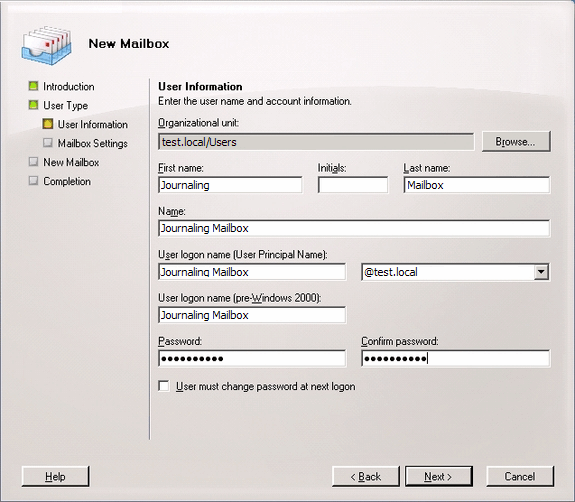 Specify the User information details for the new user to which the new journaling mailbox will be assigned and click Next.