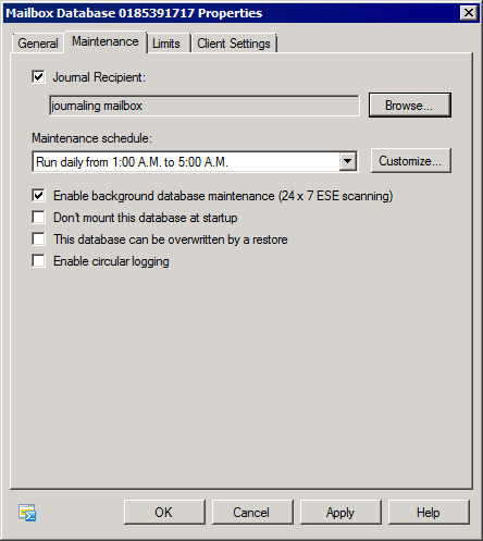 From the Mailbox Database Properties dialog, choose the Maintenance tab and check the Journal Recipient box. Click Browse and select the previously configured journaling mailbox.