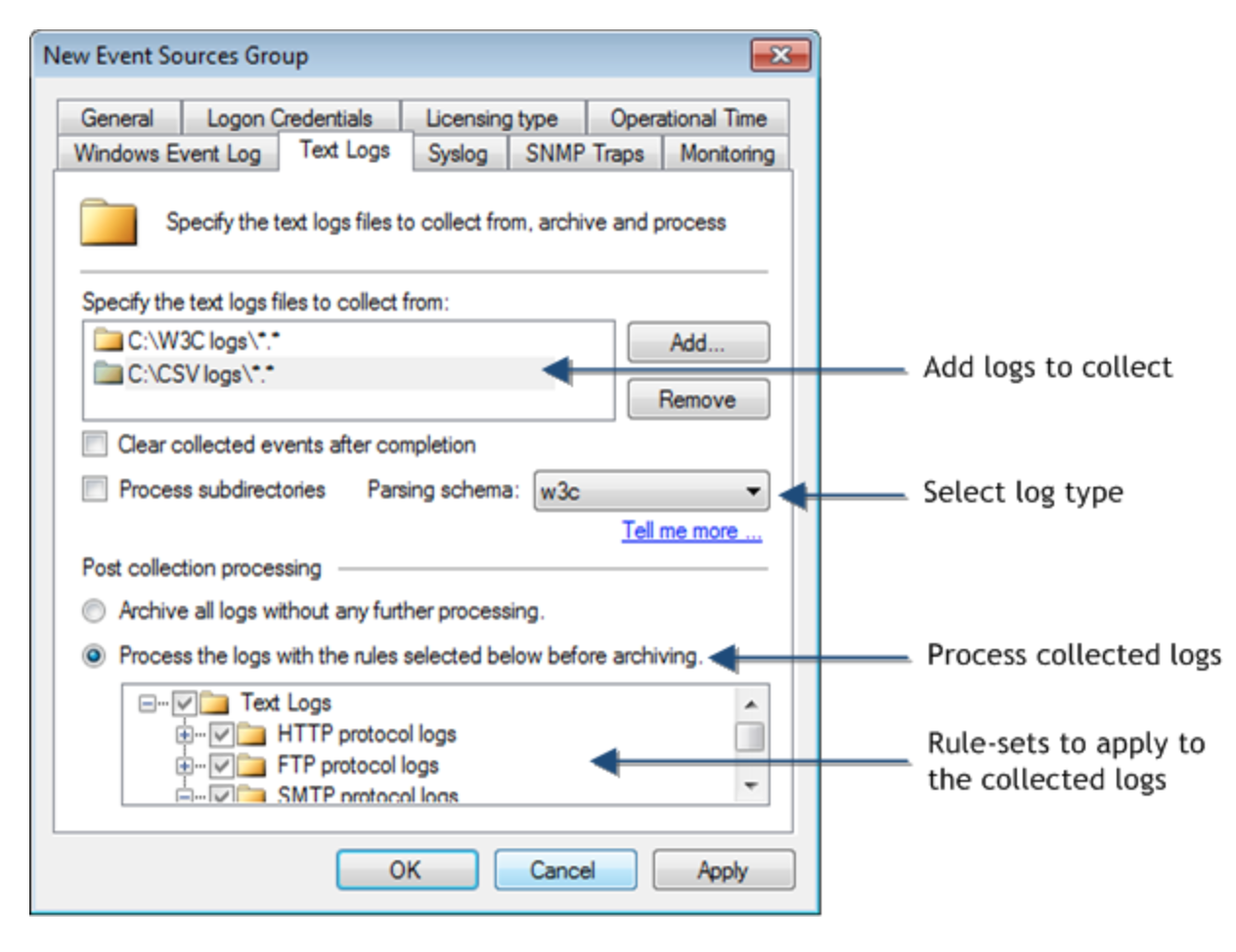 8. Select Process the logs with the rules selected below before archiving and select the rule sets that you want to run against the collected events.