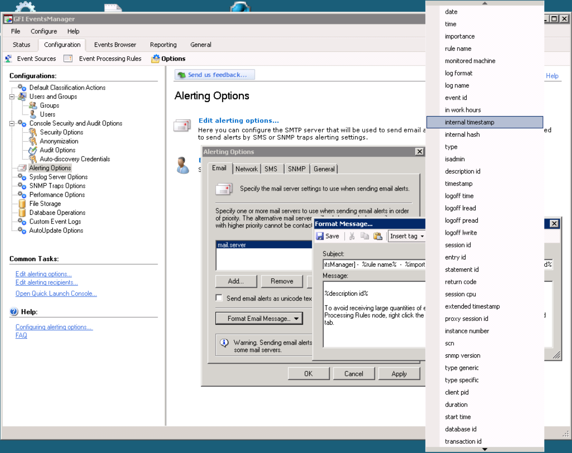 There are many tags that can be added to the alerts generated by GFI EventsManager. To modify one of the alerts, do the following: